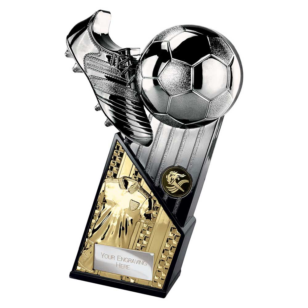 A refined blend of carbon black and deep gunmetal tones sets the stage for this Marauders football trophy, highlighted by a striking gold shirt insert that adds contrast and prestige. The sharply angled profile and sculpted boot-and-ball top create a bold, architectural silhouette, giving the award a strong sense of depth and authority. Finished with central logo space and a personalised engraving plate, it delivers a commanding presentation piece built for high-level competition and standout achievement.