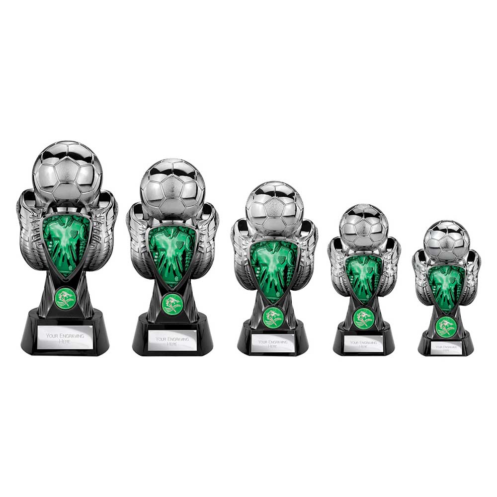 With its deep green shirt insert and high-contrast silver detailing, this football trophy delivers a bold, contemporary look that instantly commands attention. The sculpted ball and layered contours give the design depth and texture, creating a striking sense of dimension from every angle. Set on a solid black base with central emblem space and engraving plate, it offers a strong, modern presentation ideal for clubs looking to reflect their identity through their awards.