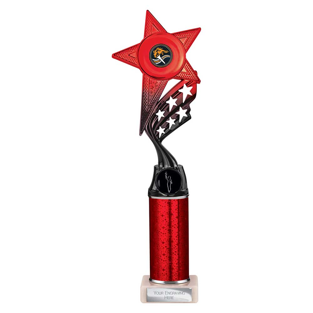 This trophy features a multisport figure mounted on a tall, glossy red tube pillar with black accents. Flowing star-pattern details highlight the sculpted figure, and the high-gloss finish enhances the dynamic shape. The red tube adds height and bold visual impact, all mounted on a solid black base with a central metal engraving plate for personalised text.