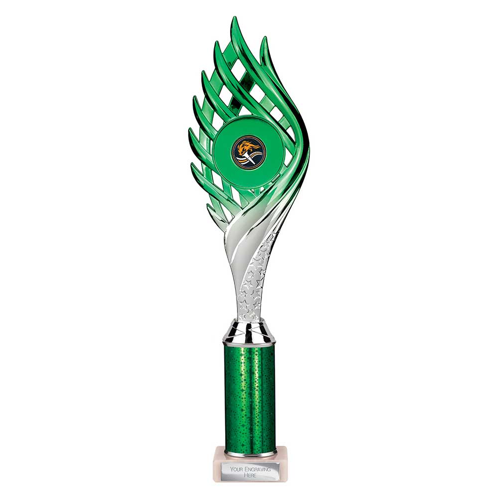 Capture the spirit of achievement with this Wildfire Tube trophy in vibrant green flames. The dynamic flame motif sits atop a sleek silver tube column, giving it impressive height and a contemporary look for multisport champions.