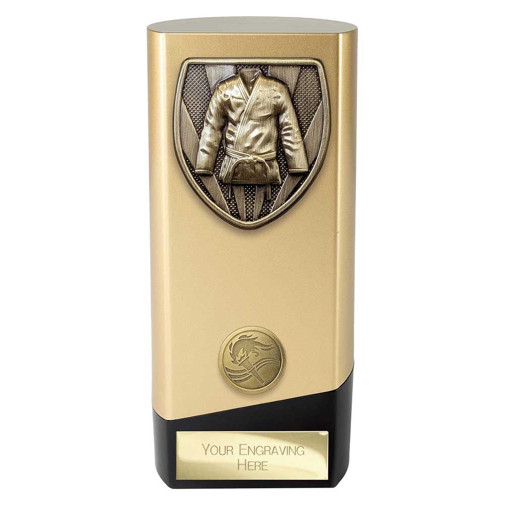 This martial arts-themed trophy features a striking gold body with a contrasting black base. The central shield showcases a detailed gi robe design along with decorative motifs, while a gold engraving plate is included for personalised text.