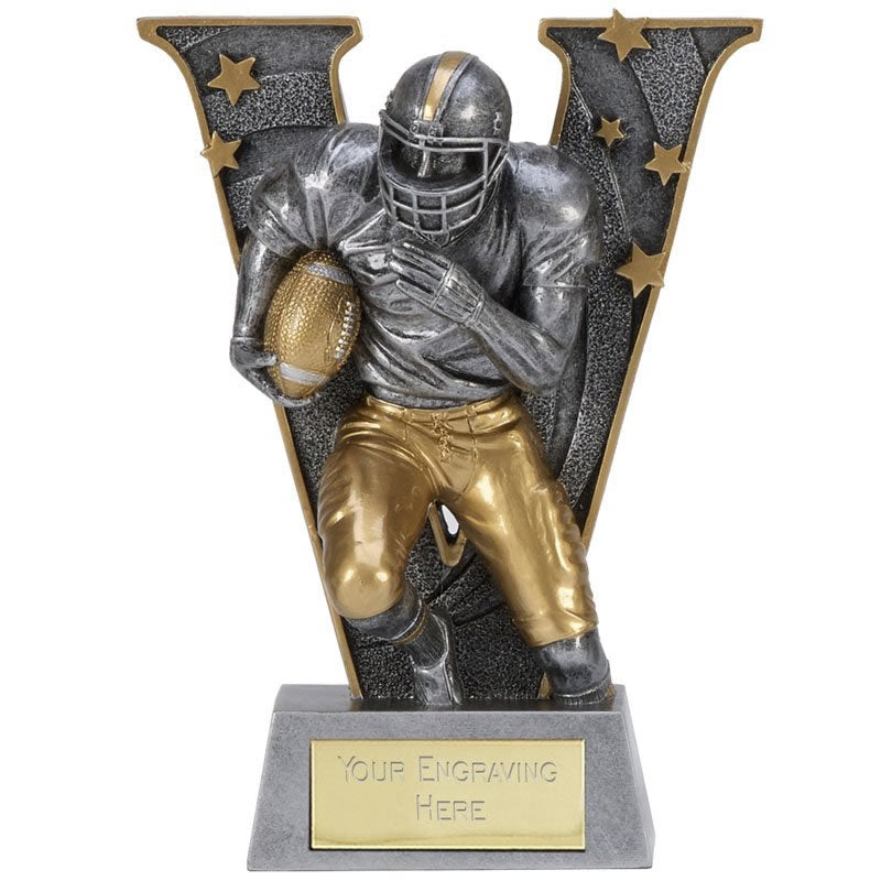 Introducing the American Football V Series Trophy, the perfect way to recognise and reward outstanding performances on the field. This stunning trophy features a highly detailed, figurine of a footballer, standing in front of a V for victory. The trophy Is finely crafted from resin and comes in 3 sizes.