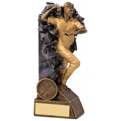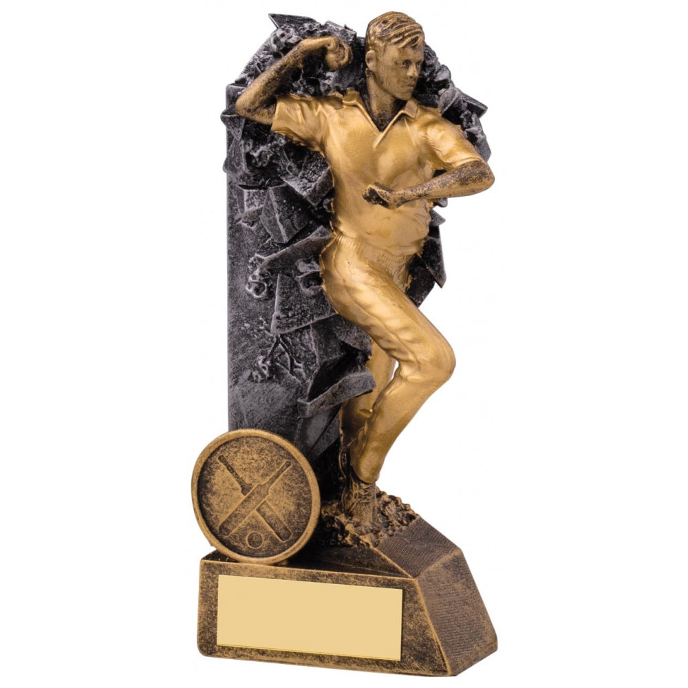 Celebrate outstanding performance on the field with the Breakout Cricket Bowler Award. This dynamic trophy, available in two sizes, features a striking gold male figure bursting through a wall, poised to deliver the perfect throw. The design captures the energy and precision of a top bowler. The award includes a dedicated space for a 25mm logo to the left of the figure's feet, adding a personalized touch. The sturdy base offers room for up to three lines of engraved text, making it a perfect choice for commemorating exceptional achievements in cricket.