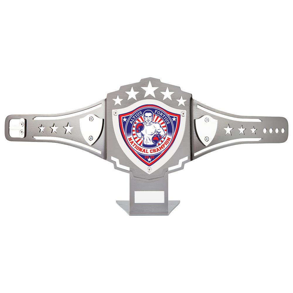 The Champion Boxing Belt Award Trophy features giant replica boxing title belt with stand and space for engraving with your personalisation details, a unique piece which is guaranteed to attract attention.