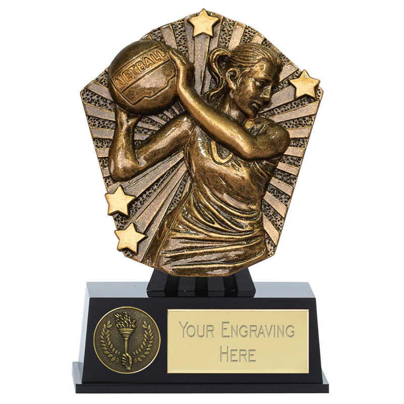 Celebrate your team's success with the Netball Trophy Cosmos Mini Award! This stunning antique gold coloured resin trophy features a netballer with ball on an explosive background and can be personalised with a message and your team logo. Show your appreciation and recognition with this amazing award!
