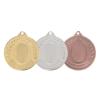Celebrate rugby greatness with the Discovery Rugby Medal, available in gold, silver, and bronze! This 5cm medal features a striking rugby ball at the centre, with "Rugby" prominently displayed on a ribbon at the bottom. The top is elegantly framed by a traditional wreath, adding a classic touch. The detailed design captures the essence of the sport, and you can personalise it with a small engraved message on the back. Perfect for recognising exceptional performances and dedication on the rugby field!