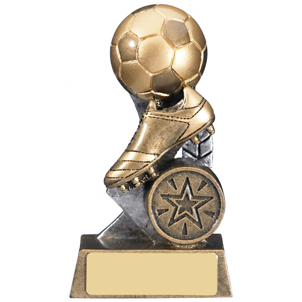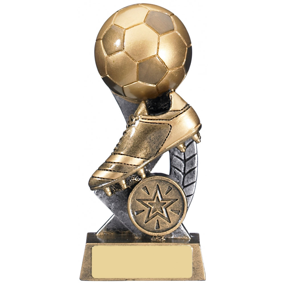 The Escapade II Football Trophy, available in two sizes, is a standout choice for celebrating football excellence. This striking trophy features a gold football boot with a football perched on top, complemented by elegant bronze accents. Just below, a 25mm space allows you to add your own logo, enhancing the personal touch. The base provides room for up to three lines of engraved text, making it perfect for honouring exceptional performances and memorable moments on the pitch.