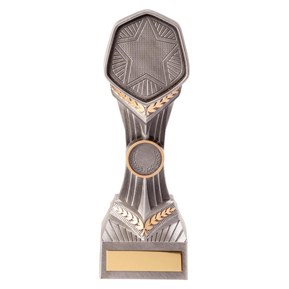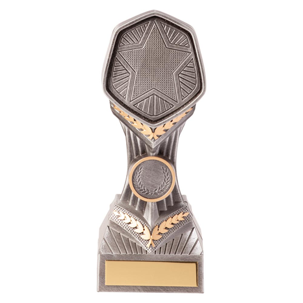 The sticky back centres are designed in-house using top-of-the-range technology, ensuring top-quality results. There are two separate locations on the award for adding your custom Logo/Design, including a larger 3-inch, hexagonal area to the top above the decorative, golden laurel springs with a smaller 1-inch round disc space underneath.