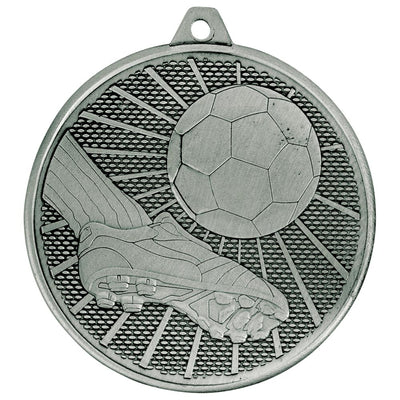 A great price for a top-quality iron medal. The Formation Football medal is embossed with a detailed image of a boot striking a football. There are light rays beaming out from the football on a textured background.