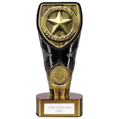 Make achievements shine with the Fusion Cobra Well Done Award! Available in two sizes, this striking trophy features a central star encircled by bold “Well Done” text with a stunning gold-to-black fusion colour scheme. It offers space for up to three lines of engraving and the option to include a team logo, adding a personalised touch. Ideal for recognising hard work and success, the Fusion Cobra Well Done Award combines elegance and customisation to highlight every accomplishment.