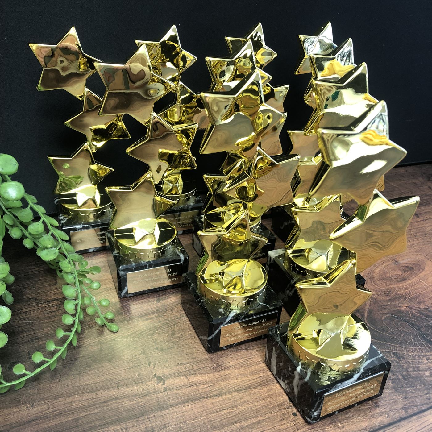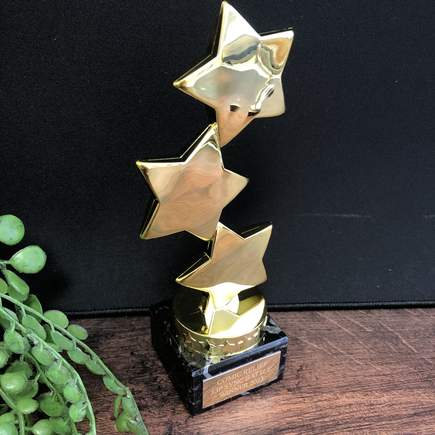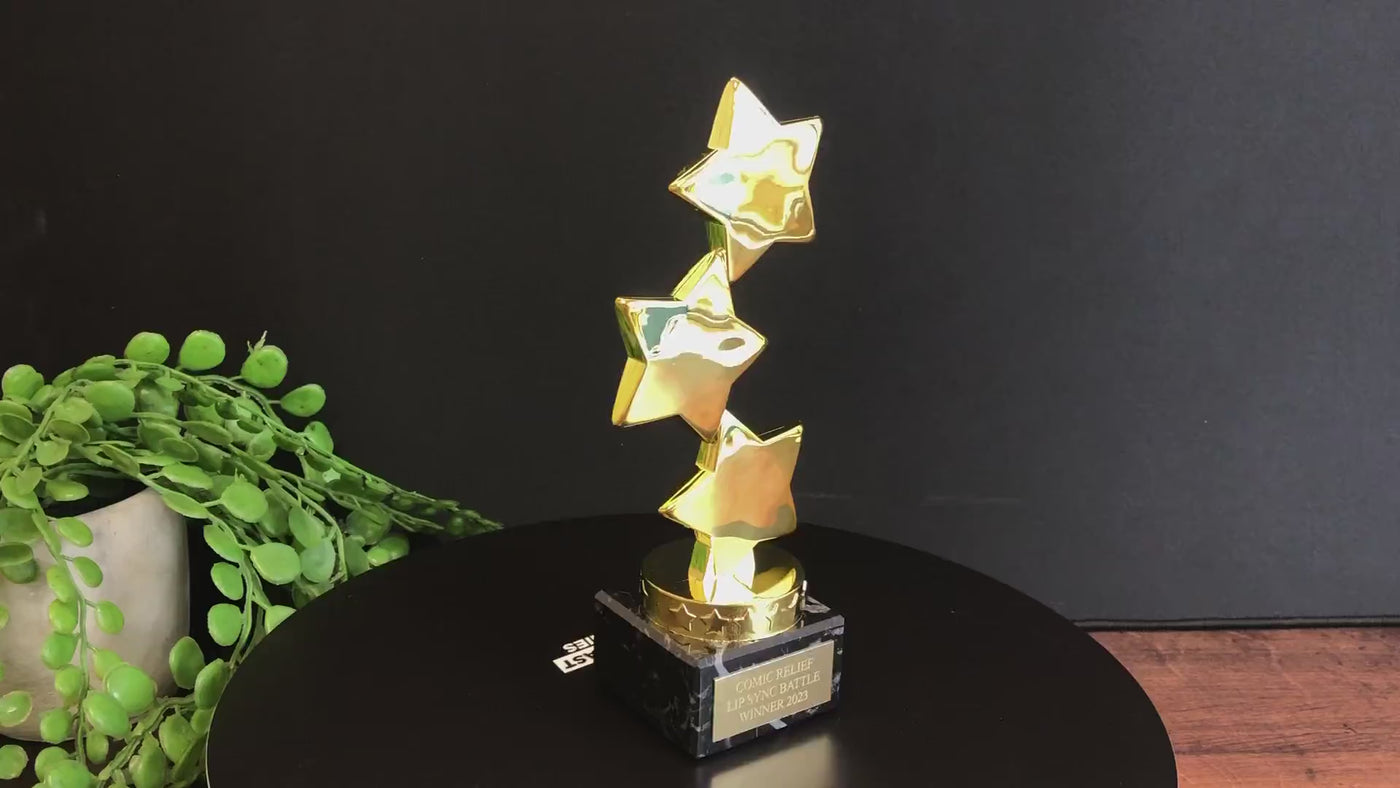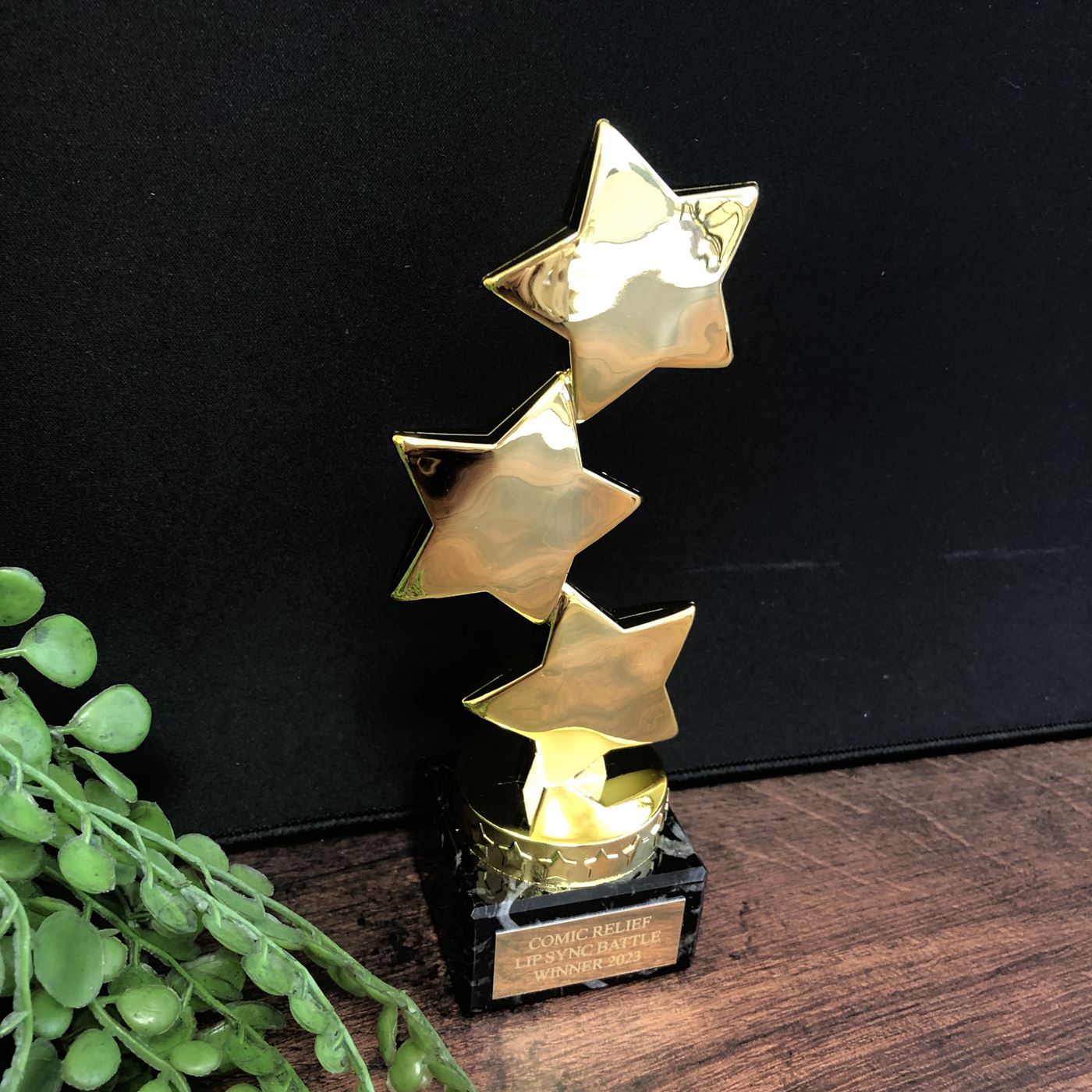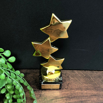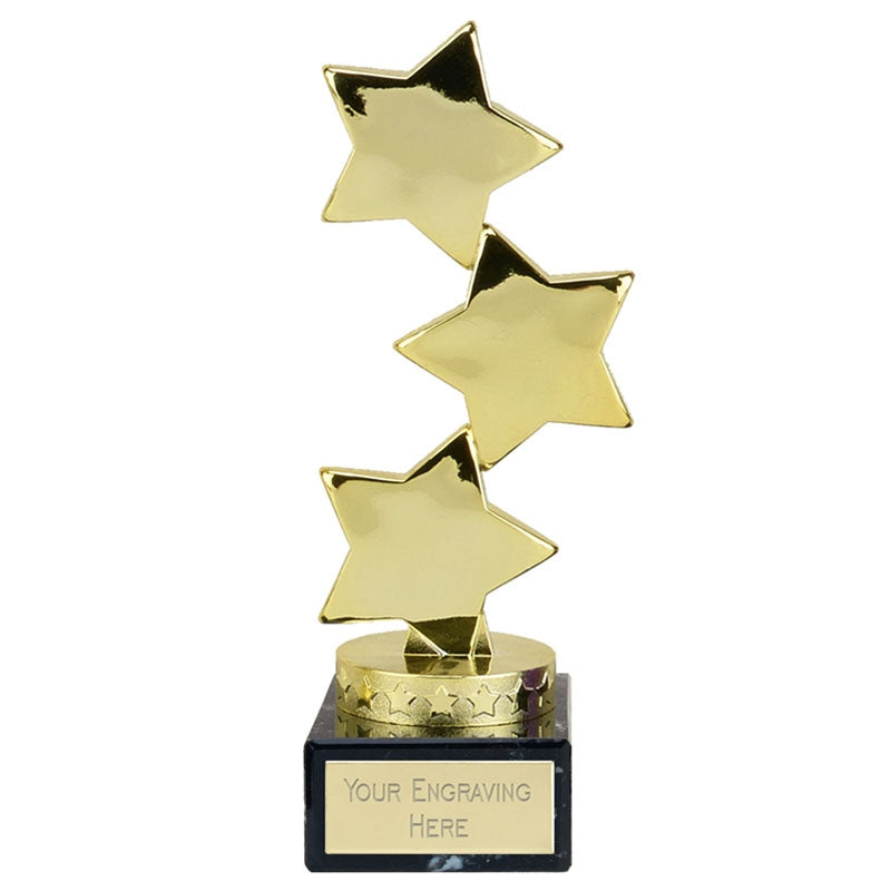 The popular Gold Hope Star Award is a premium quality plastic trophy featuring 3 balancing stars set on a gold round base with further smaller star detail. The shiny glazed star-topped trophy stands on a solid black marble base with space to add a metal engraving plate for personalisation. This trophy is also available in Silver.