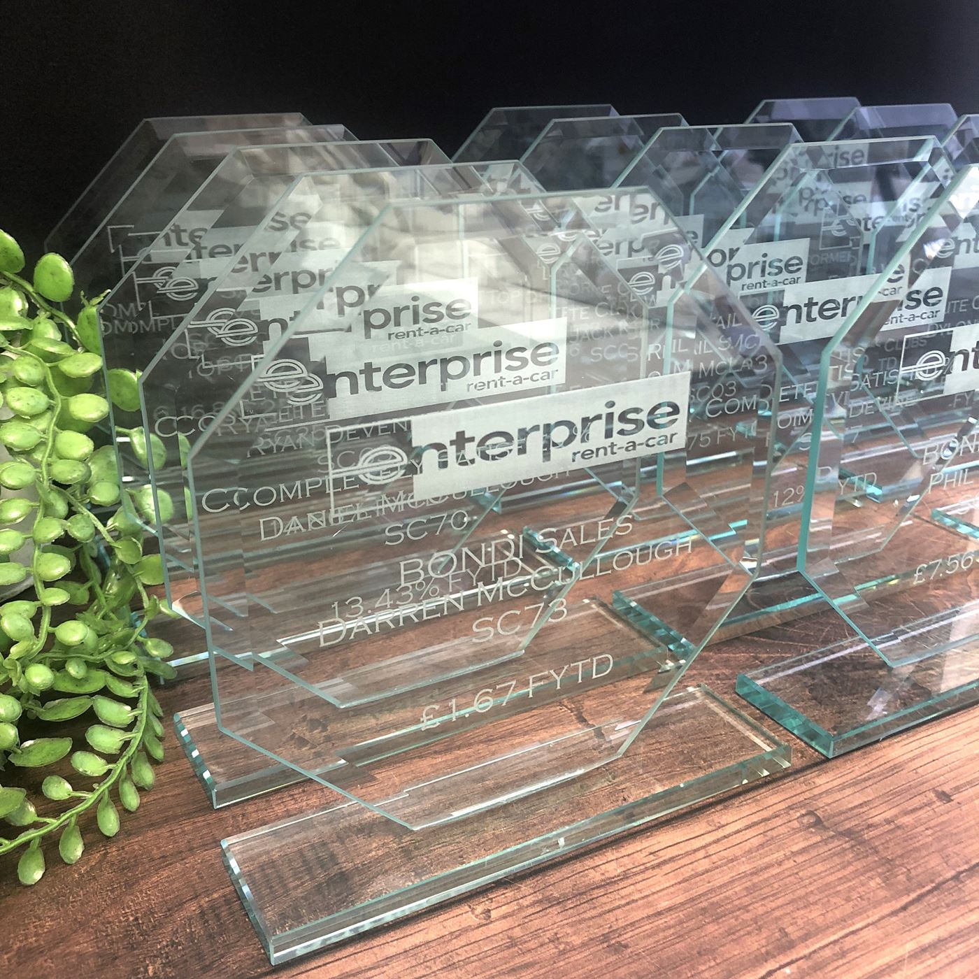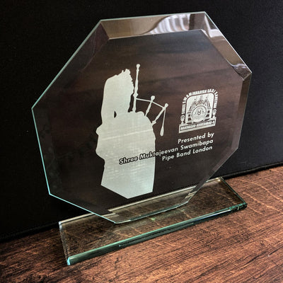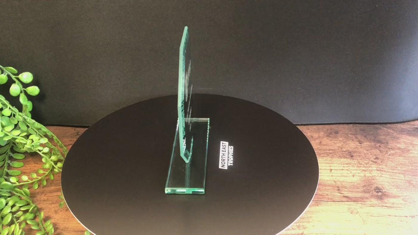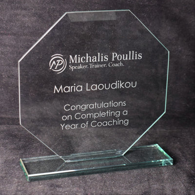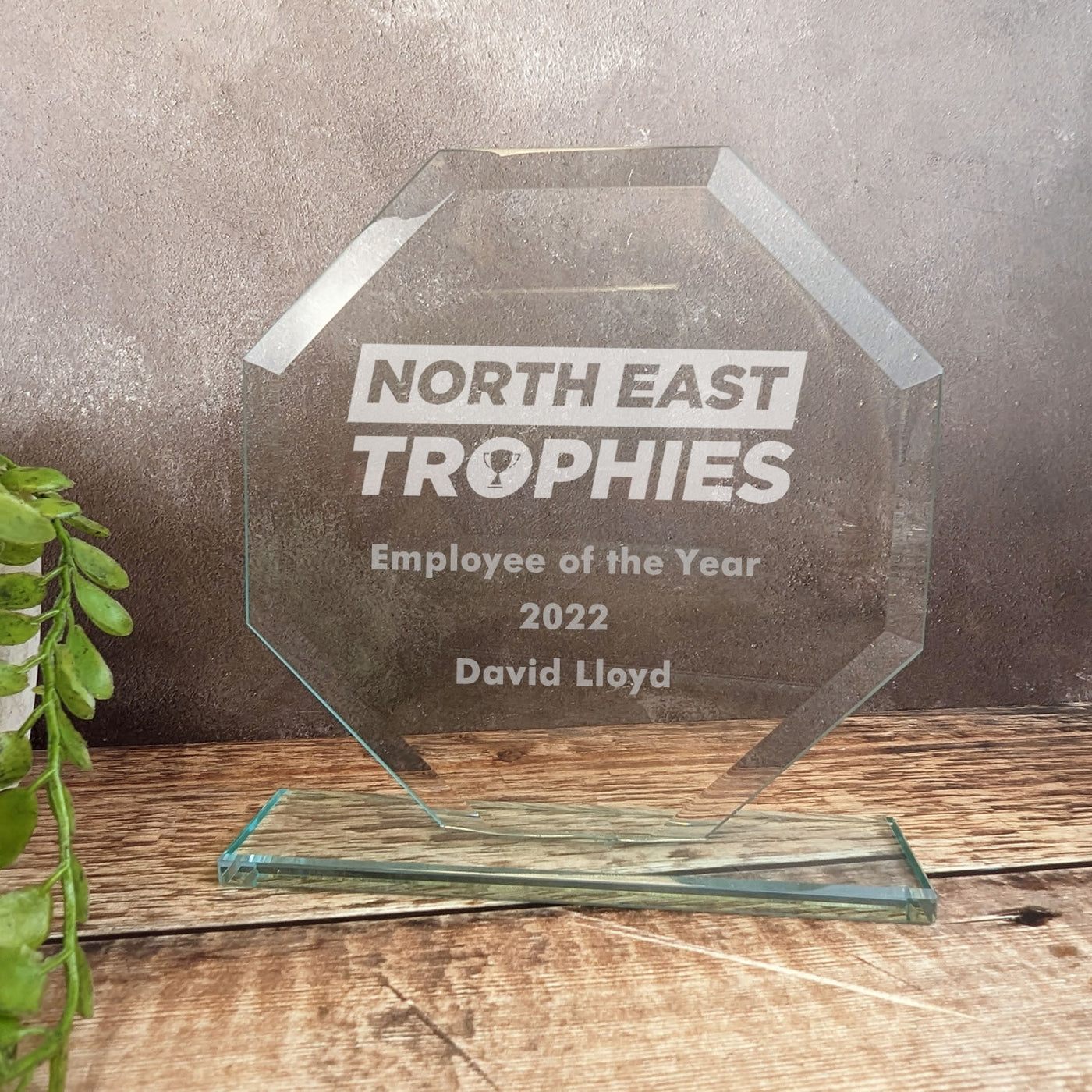 One of our best sellers! This heavyweight Jade Glass award makes for the ideal business/corporate award. It's octagonal shape and beveled edges allow light to pass through this clear award, producing a dazzling look whilst sitting proudly on its solid glass base.