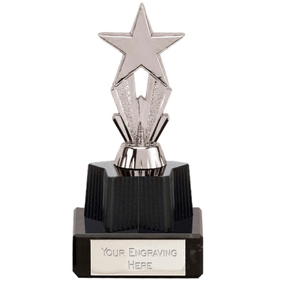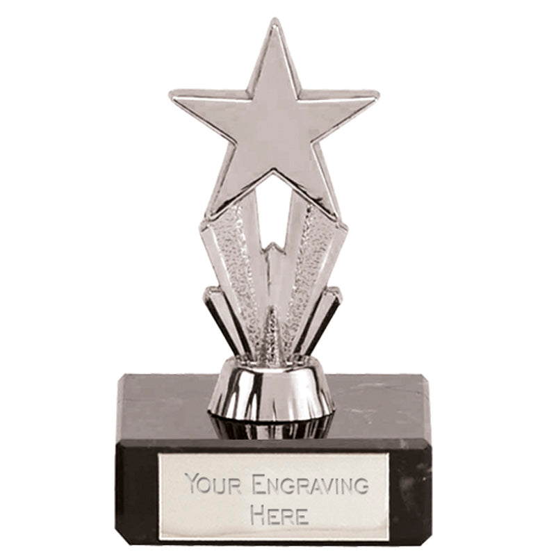 The Silver Mini Star Award Trophy is the perfect way to recognise and reward outstanding achievements. Made from lustrous silver-plastic with a heavy-weight marble base, this trophy features a classic shooting star design. Available in a 3 inch or 4 inch size , it's compact size makes it easy to display on shelves, desks or mantels. Whether given as a reward for academic excellence, athletic achievement, or artistic accomplishment, this star trophy is sure to be treasured for years to come. So surprise your star performer with this elegant and timeless award, and let them shine bright like the star they are!