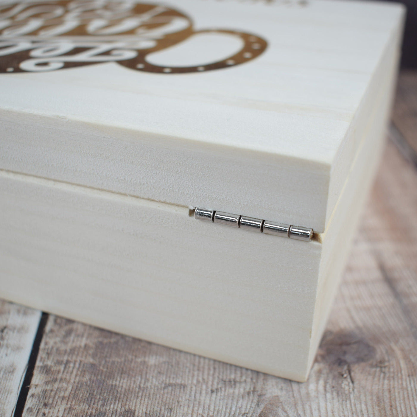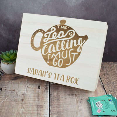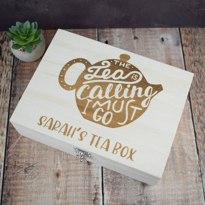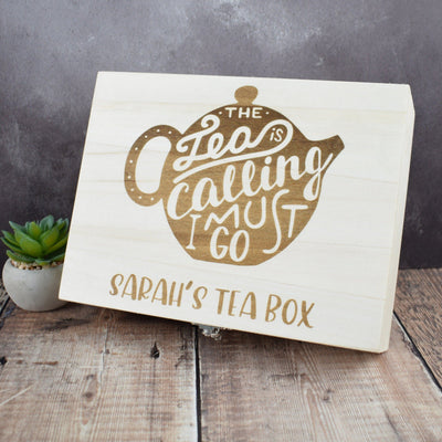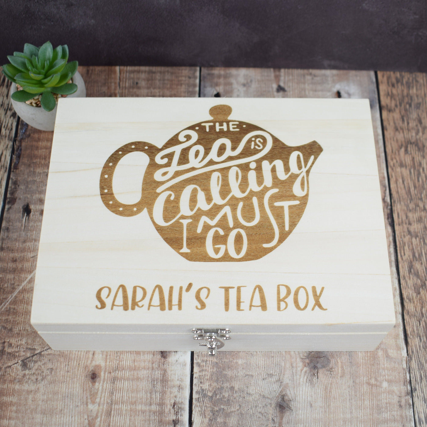 The perfect custom gift for all lovers of tea, this box will be engraved as pictured with the 'The Tea is Calling I Must Go' image.