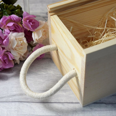 Each box has an easy slide clear acrylic lid, is made from FSC approved pine timber and comes with a removable rope handle making it easy to add your own gift tag.