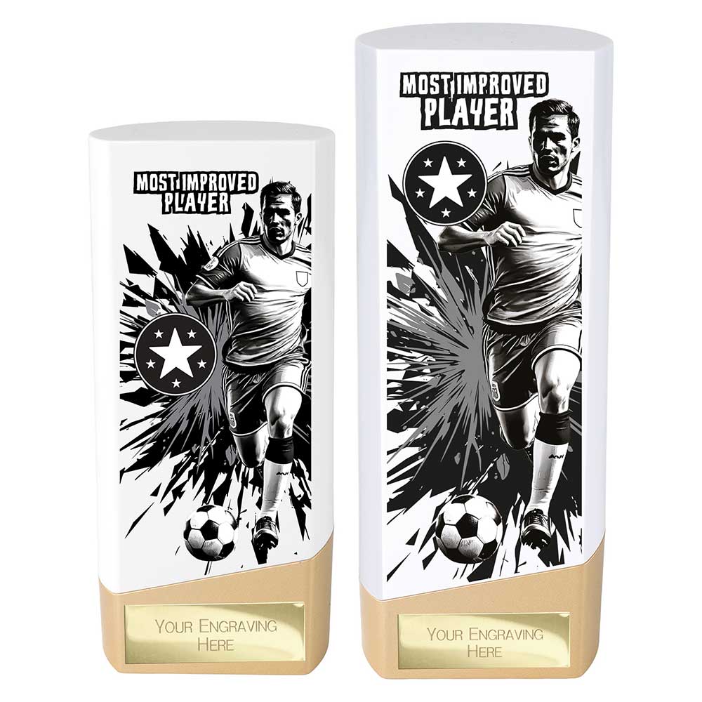 Recognise dedication and growth with the Prime Heavyweight Most Improved Football Trophy Award. Crafted from durable plastic in white and gold, this trophy features a footballer running with the ball against a smashed shard style background for a bold, high-impact look.