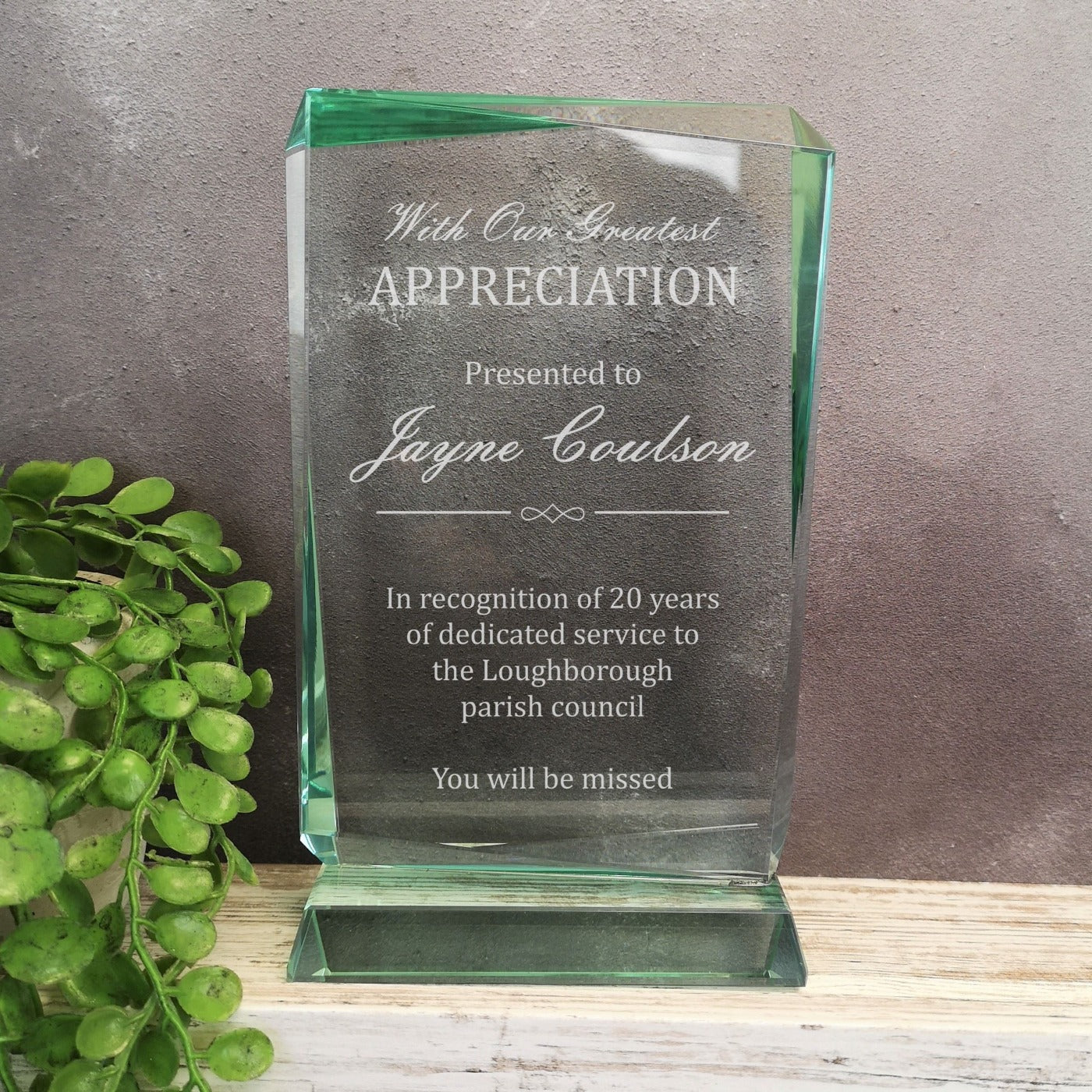 This Renegade Jade Crystal Long Service or Appreciation Award is perfect for recognising the achievement of any corporate, sporting or school occasion. These crystal trophies can be personalised with your own message.