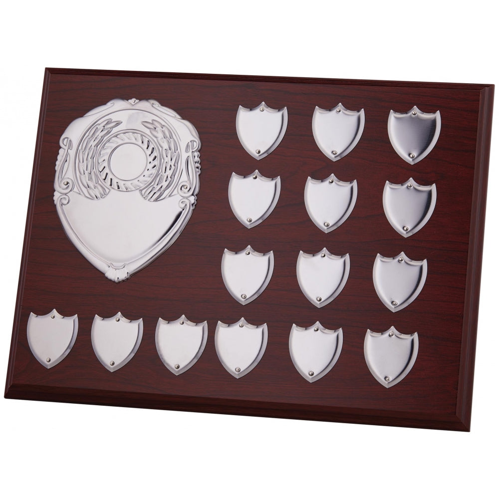 The Royal Presentation Annual Plaque Award is a distinguished accolade featuring a sophisticated design with fifteen beautifully arranged shields. The main shield, positioned prominently on the left, provides ample space for a personalised title and a logo. This strategic placement ensures that both the title and logo are displayed with clarity and distinction. The fifteen shields in this prestigious plaque represent a commitment to excellence and celebrate exceptional achievements with timeless elegance.