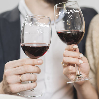 Whether its an cool, crisp Zinfandel or a full-bodied Merlot that you reach for what better way to do it than with this set of 2 personalised wine glasses. These engraved wine glasses will make a wonderful wedding gift and can be engraved with the newlyweds names.