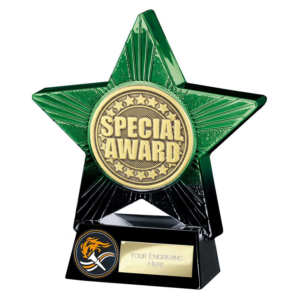 This star-shaped trophy features a glossy green-to-black ombre finish with embossed stripes, showcasing “Special Award” at the centre surrounded by a star motif. Mounted on a solid plinth.