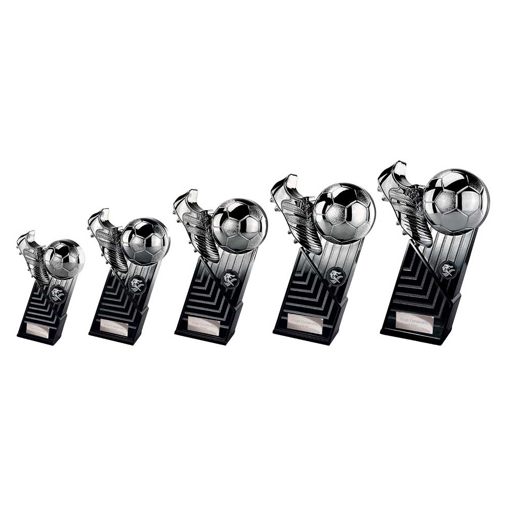 The Marauders football trophy delivers a powerful, modern design centred around a dynamic leaning block shape, topped with a striking boot and ball detail that captures the intensity of the game. The angular lines and layered textures create depth, movement, and a strong sense of direction, giving the award a distinctive visual edge. Finished in polished metallic tones and mounted on a solid black base with space for a centre logo and personalised engraving, it offers a commanding presentation piece built for standout performances, tournament wins, and major finals.