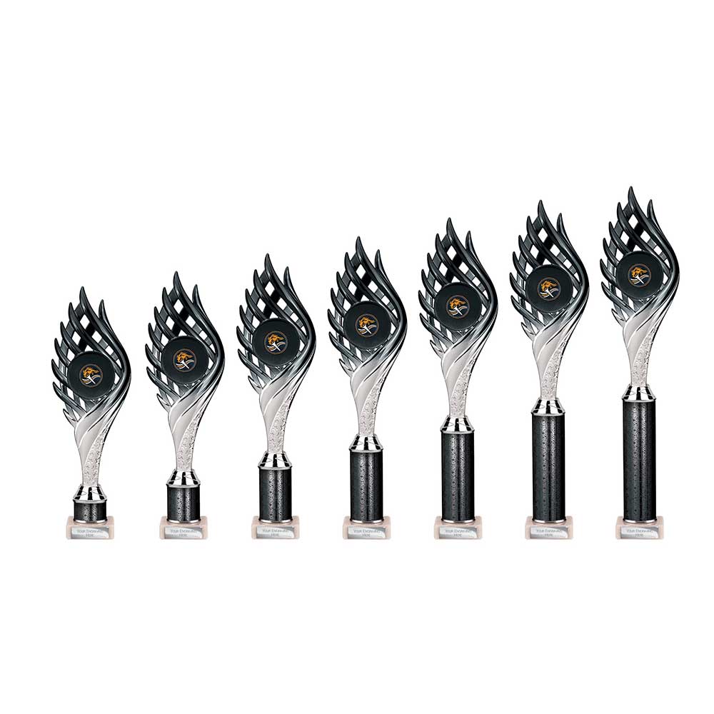 This Wildfire Tube trophy combines striking black flames with a polished silver tube column, creating a bold, contemporary look. The award’s dynamic vertical design celebrates multisport excellence with style and presence.